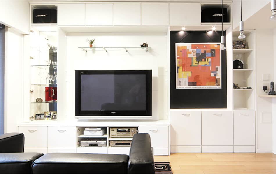 飾るオブジェが美しく映えるTVボードは、ガラスの飾り棚背面にミラーを入れ、ダウンライトを仕込んでいます。