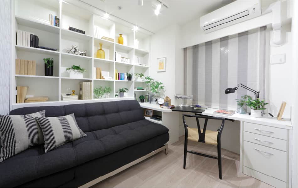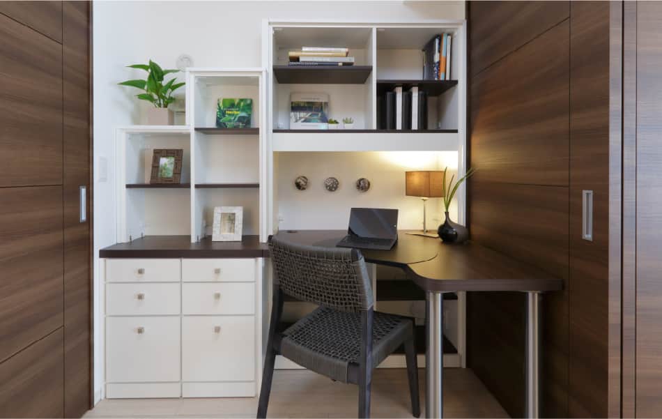 TVの両脇に、ワークスペースを。リビングルームの雰囲気を壊すことなく、書斎を隠して収納できます。